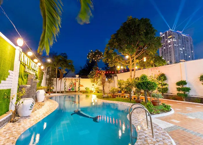 Located within 700 metres of Tao Phung Park, the beachfront Villages Blue Day Bai Sau Rong Ho Boi Dep offers canoeing, snow skiing, and archery to diversify guests' leisure. Nestled in the Back Beach district, the 10-bedroom villa features an infinity swimming pool, along with a plunge pool, a Turkish bath, and a solarium, ensuring a more relaxing experience.